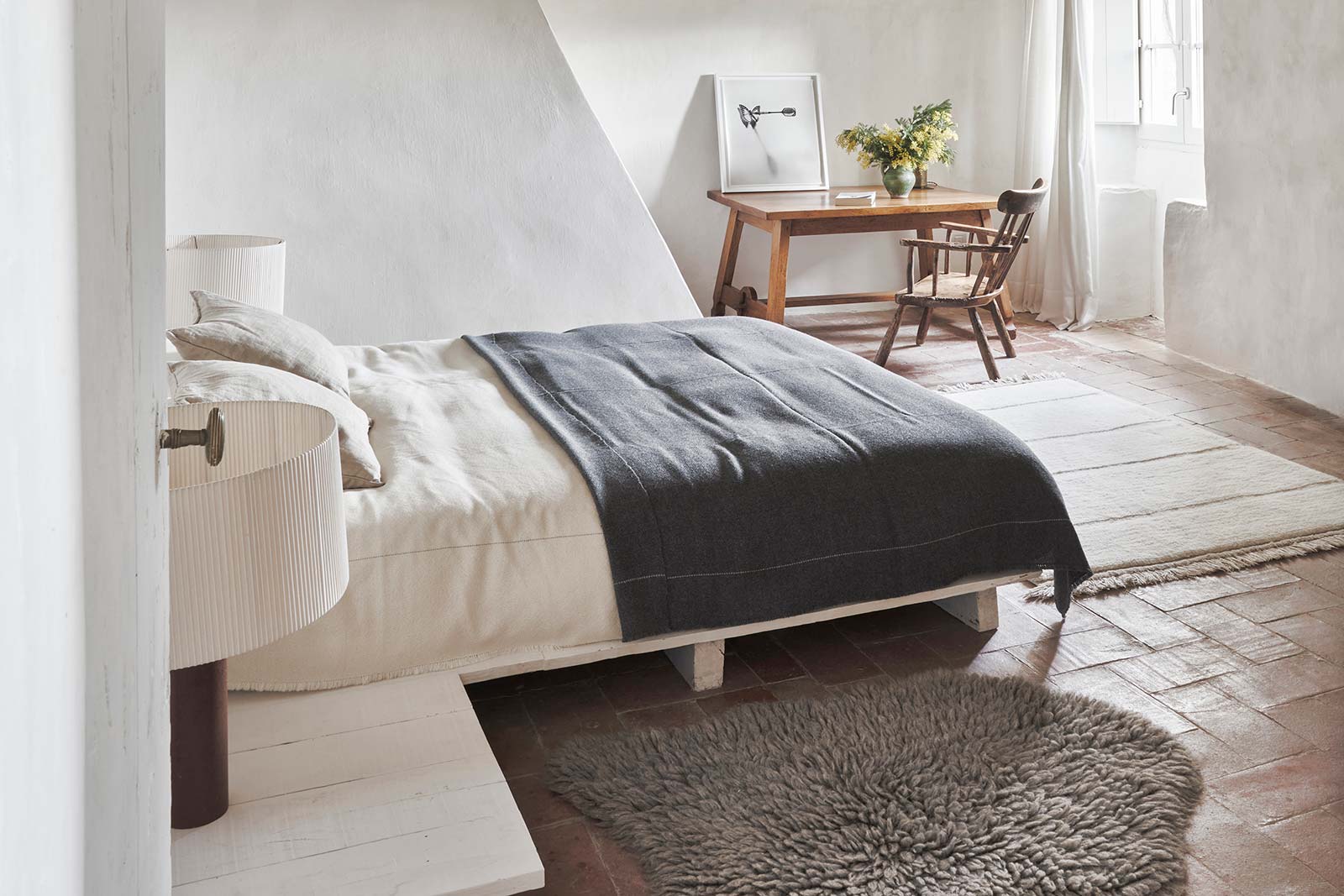 Le tapis Woolable de Lorena Canals a une forme arrondie, imitant la silhouette d’une peau de mouton, et est fait de poils de laine duveteux tuftés sur une base en coton.